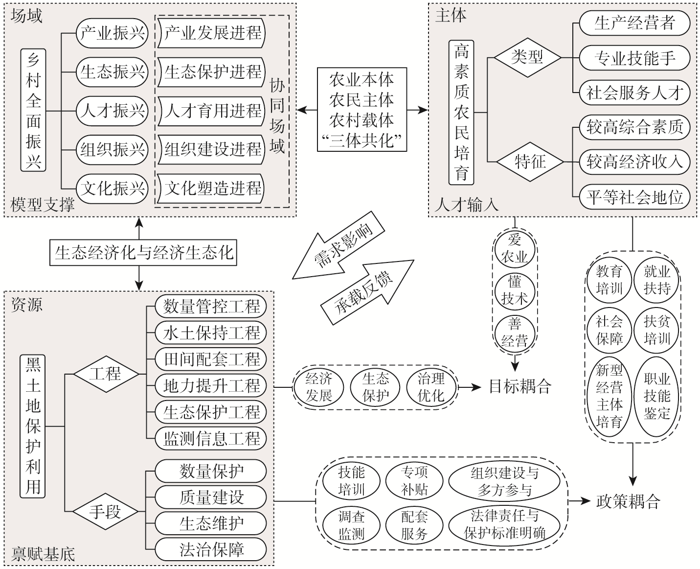 高素质农民培育与黑土地保护利用是东北地区乡村全面振兴的重要抓手。依托“三螺旋”理论,运用归纳演绎法分析了乡村全面振兴、高素质农民培育和黑土地保护利用的角色定位、逻辑关系和协同机制,并提出了协同推进的具体路径。研究表明:乡村全面振兴、高素质农民培育和黑土地保护利用三者形成“场域—主体—资源”综合治理模式。乡村全面振兴为模式支撑,高素质农民培育实现人才输入,黑土地保护利用夯实资源基底,高素质农民培育主体优势与黑土地保护利用治理效能可相互转化;后二者在乡村产业发展、生态保护、人才育用、组织建设和文化塑造场域中逐步相互适应并正向影响;乡村产业系统创新、生态治理协调、英才育用优化、组织重构和文化传承的进一步实践可提升协同效能。