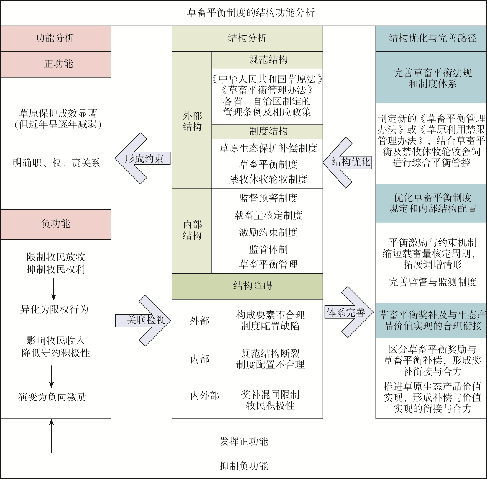 草畜平衡制度在抑制牧民超载放牧、保护草原生态平衡方面发挥着重要作用,但部分地区草畜矛盾、草地退化等问题依旧严峻。运用结构功能分析法对中国草畜平衡制度进行分析发现,草畜平衡制度的实施呈现出草原保护成效较为显著,通过法律手段明确制度运行的职、权、责关系的正功能,但也产生了限制放牧行为、抑制牧户权利、最终成为一种限权行为,以及影响牧户放牧收入、降低牧户守约积极性、产生负向激励的负功能。因果检视表明,草畜平衡规范结构断裂与制度结构配置不合理的外部结构障碍,核定周期过长、约束与激励失衡和监督监测制度局限的内部结构障碍,以及奖补混同抑制牧民积极性的内外部结构衔接障碍,共同制约了制度功能的发挥。鉴于此,应统筹草畜平衡与禁牧、休牧、轮牧、舍饲等制度,完善草畜平衡法规和制度体系,优化激励约束平衡、载畜量核定和监督监测制度,构建草畜平衡补奖与草原生态产品价值实现的衔接制度,破解制度结构障碍。