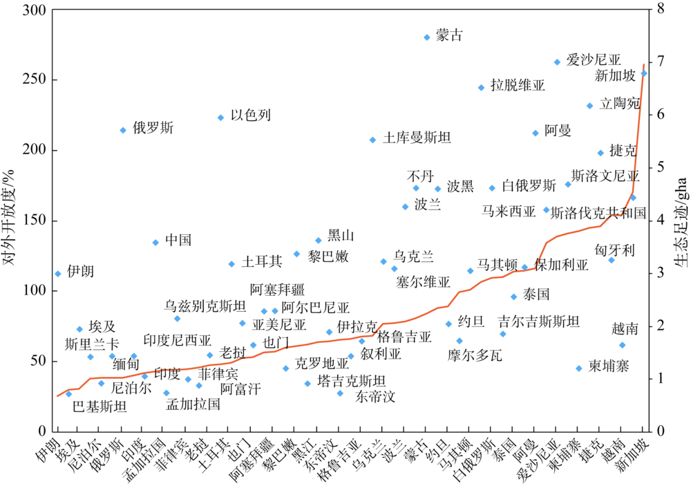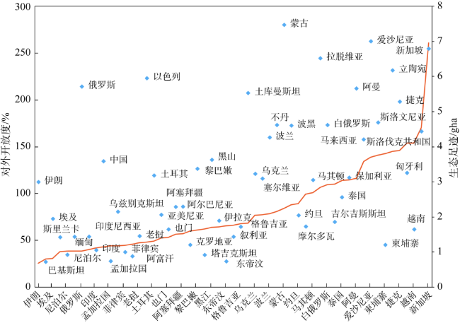 Fig. 2 The correlation between the national ecological footprint value and the opening degree of the country along the Belt and Road in 2013图2 2013年“一带一路”沿线国家生态足迹值与对外开放度相关性 |