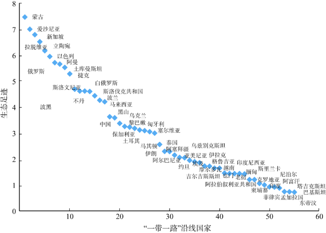 Fig. 1 Distribution map of the national ecological footprint along the Belt and Road in 2013图1 2013年“一带一路”沿线国家生态足迹值分布 |