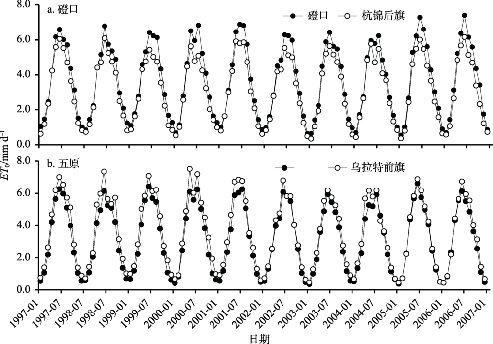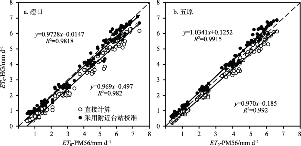 Fig. 4 Comparison of measured and calculated ET0 with Hargreaves equation when only air temperature existed at both study sites (a, DK; b, WY)图4 磴口站和五原站仅有温度数据时用Hargreaves公式计算的ET0值(ET0-HG)与实测值(ET0-PM56)的比较 |