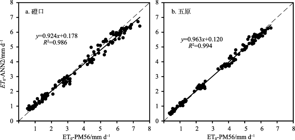 Fig. 5 Comparison of measured and calculated ET0 with ANN model when only air temperature existed at both study sites (a, DK; b, WY)图5 磴口站和五原站仅有温度数据时用ANN计算的ET0值(ET0-ANN2)与实测值(ET0-PM56)的比较 |