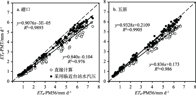 Fig. 2 Comparisons of measured and calculated ET0 with estimated weather parameters when only air temperature existed at both study sites (a, DK; b, WY)图2 磴口站和五原站仅有温度数据时用估算气象数据法计算的ET0值(ET0-PMT)与实测值(ET0-PM56)的比较 |