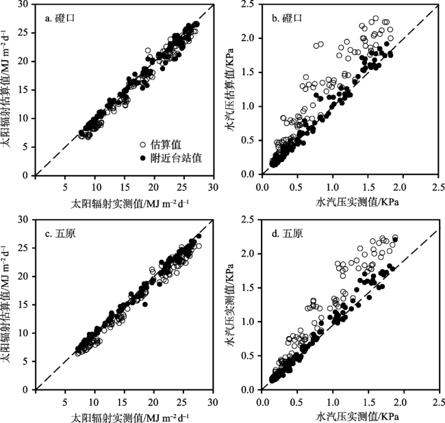 Fig. 3 Comparisons of measured and estimated solar radiation (a and c) and water pressure (b and d) for DK (a and b) and WY (c and d) stations图3 磴口站和五原站太阳辐射(a和c)和水汽压(b和d)估算值和真实值的比较 |