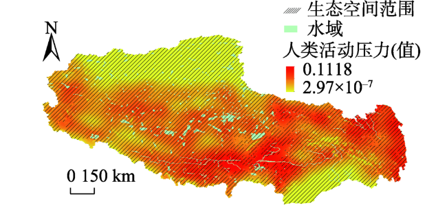 Fig. 10 Spatial distribution of human activity intensity in the ecological space in Tibet图10 西藏人类活动强度及在生态空间的分布 |