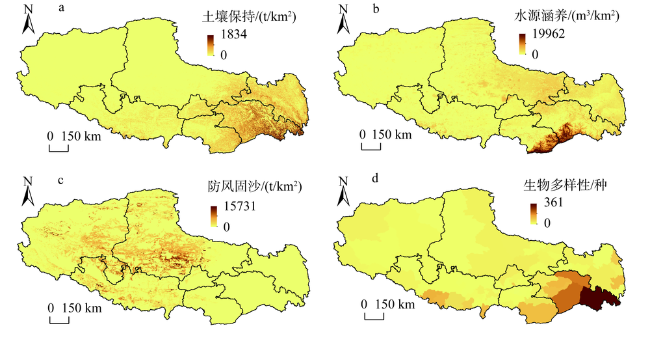 Fig. 3 Spatial distribution of main ecosystem services in Tibet Autonomous Region图3 西藏自治区主要生态系统服务分布 |