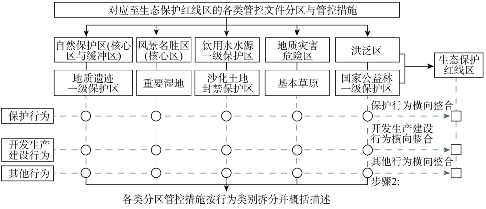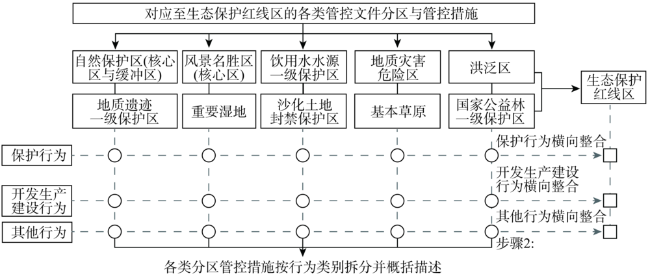 Fig. 3 The transverse integration and adjustment of the matrix of "spatial regulation districts-human behaviors" (the case of ecological protection district)图3 “管控分区—人类行为”矩阵的横向整合(以生态保护红线区为例) |