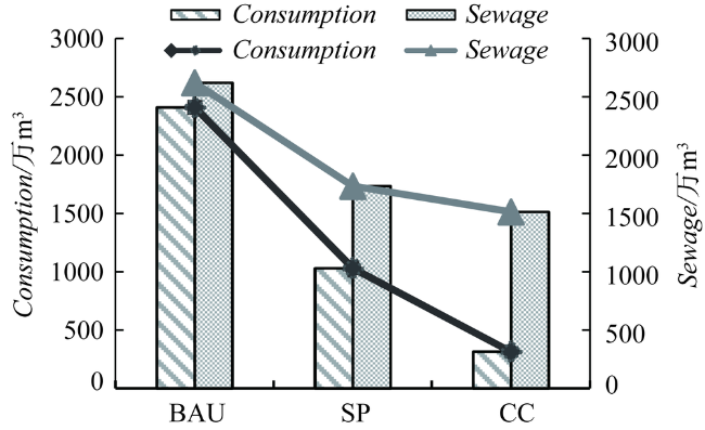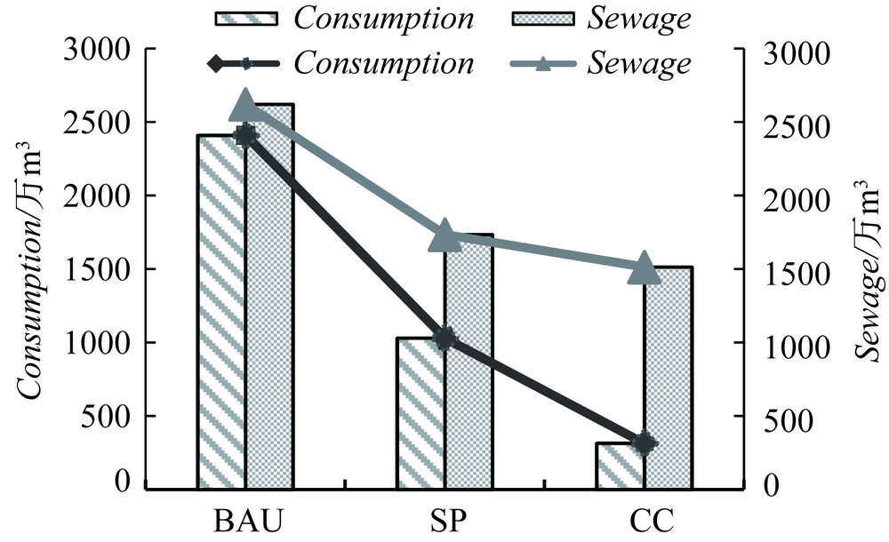 Fig. 3 The trend of total water and total sewage discharge in Xiong'an New Area图3 雄安新区用水总量、污水排放量变动趋势 |
