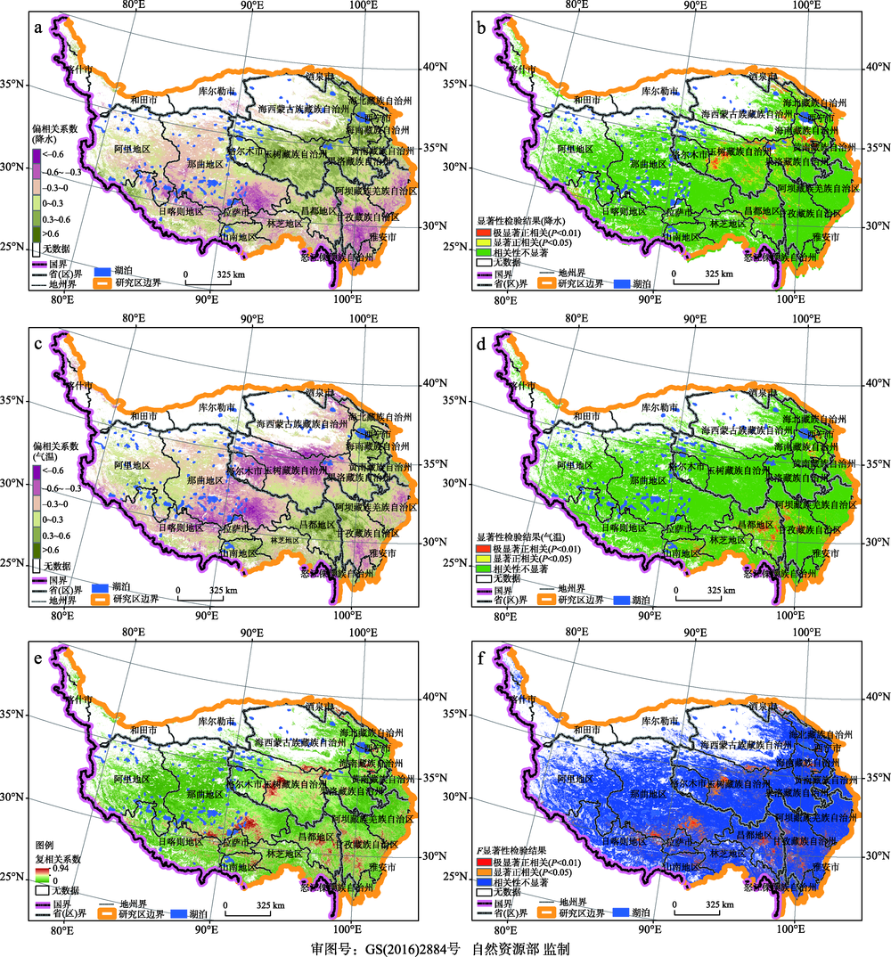 Fig. 10 Partial correlation coefficient, multiple correlation coefficient and significance test results of NPP with temperature and precipitation in the Qinghai-Tibet Plateau图10 植被NPP与气温、降水的偏相关系数、复相关系数及其显著性检验结果 |
