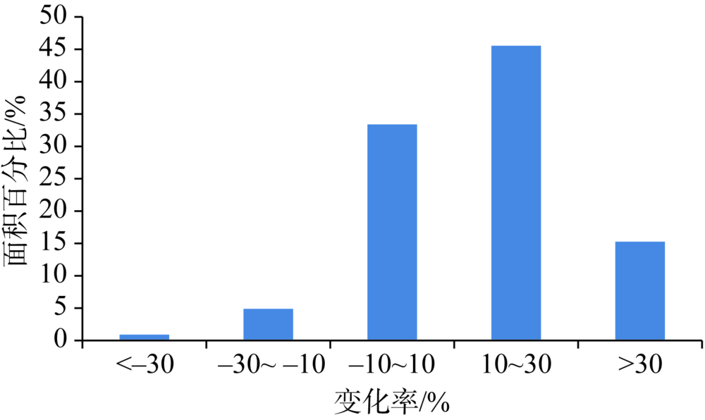 Fig. 3 Area percentage comparisons of different grades in NPP variation rates in the Qinghai-Tibet Plateau from 2000 to 2015图3 2000—2015年青藏高原植被NPP不同等级变化率面积百分比对比 |