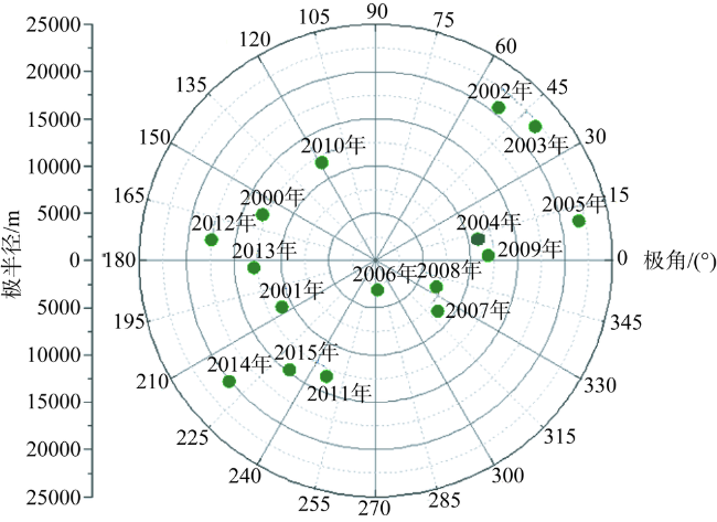 Fig. 6 Distribution ratio of NPP gravity center in the Qinghai-Tibet Plateau from 2000 to 2015 (Polar coordinates)图6 2000—2015年青藏高原植被NPP重心分布比例(极坐标系) |