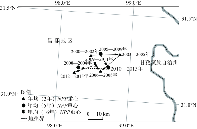 Fig. 7 Migration trajectory of NPP gravity center in the Qinghai-Tibet Plateau at different time scales图7 不同时间尺度下青藏高原植被NPP重心迁移轨迹 |