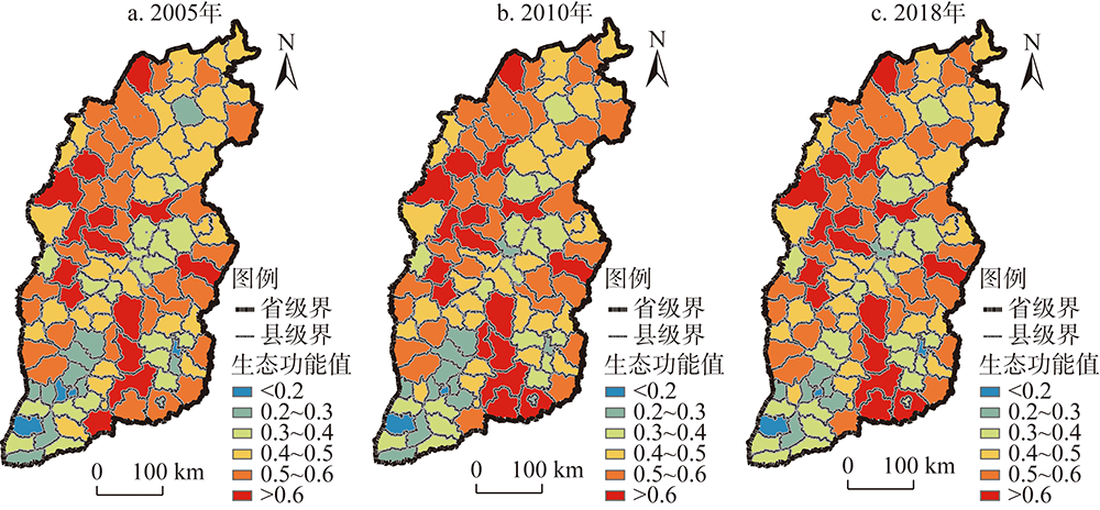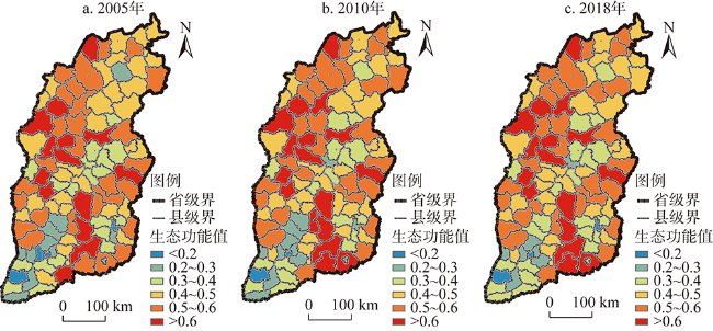 表5 2005—2018年山西省生态功能值统计Table 5 Statistics on the value of ecological function in Shanxi province from 2005 to 2018 |