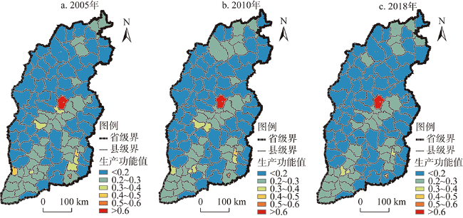 表3 2005—2018年山西省生产功能值统计Table 3 Statistics on the value of production function in Shanxi province from 2005 to 2018 |