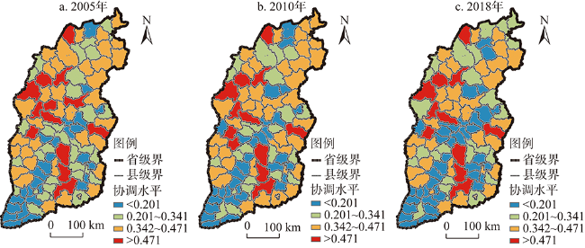 表6 2005—2018年山西省“三生”功能协调情况统计Table 6 Statistics on the coordination degree of "Production-Living-Ecological" functions in Shanxi from 2005 to 2018 |