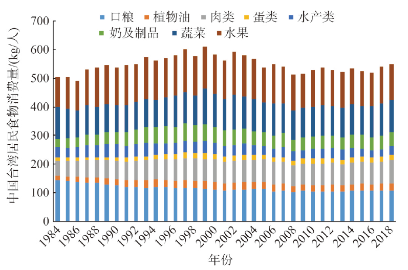 图3 中国台湾居民人均主要食物消费量注:数据来源于中国台湾农委会(http://statview.coa.gov.tw),口粮包括大米与面粉,分别按照0.73与0.85系数折算成原粮。 Fig. 3 Food consumption of residents in Taiwan, China |