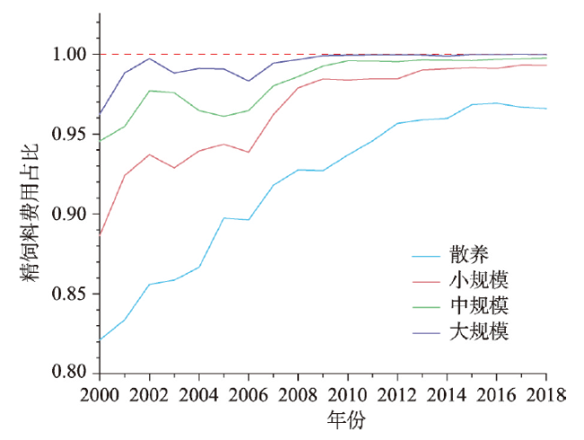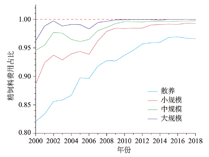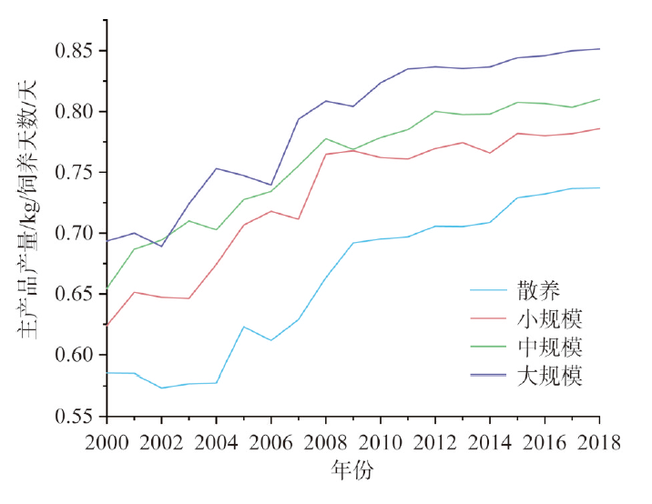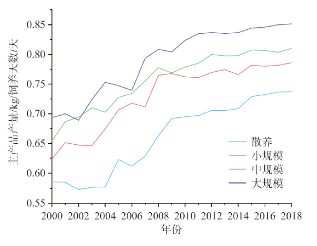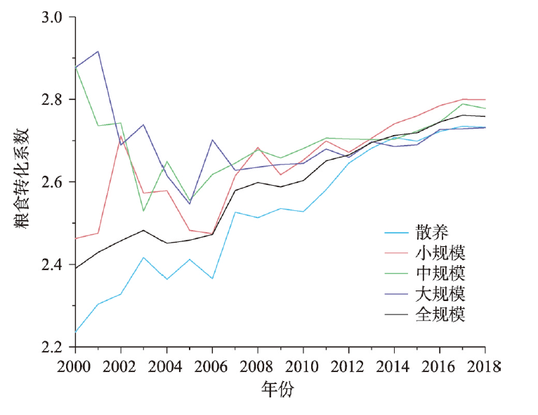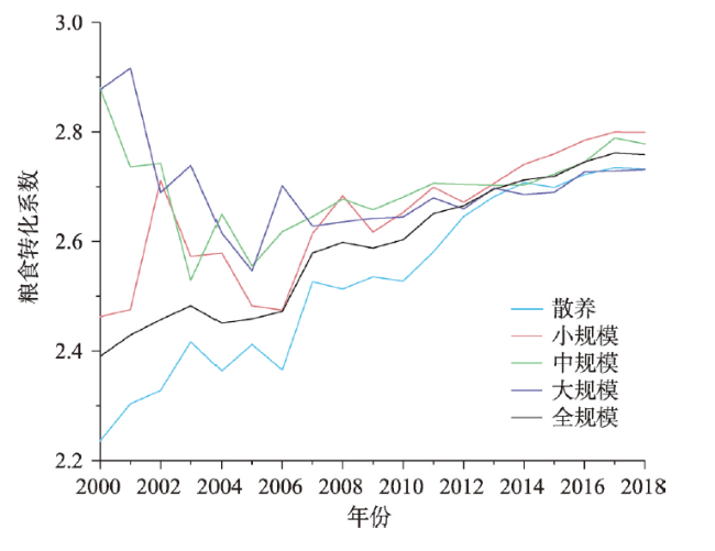 当代中国,生猪饲料粮的生产与消费已经逐渐成为影响我国粮食安全保障的重要问题。耗粮系数是合理测算饲料粮需求量的核心,厘清其时空演变特征对准确测算饲料粮数量具有重要意义。通过着重测算2000—2018年中国不同规模饲养生猪耗粮系数,探讨其时空演变特征及可能原因,得到以下主要结论:(1)近年来我国生猪耗粮系数呈现出明显的上升趋势,由2000年的2.39上升至2018年的2.76,年均增长0.023。(2)不同规模饲养生猪耗粮系数的差距逐渐缩小,主要受到饲养过程中使用的精饲料占比变化趋同的影响。(3)大规模饲养生猪的粮食转化效率和时间效率均高于其他规模。(4)散养生猪的耗粮系数在空间上呈现“南北高,中部低”,其他规模则呈现“北高南低,中部高东西低”的格局。从提高粮食利用效率的角度,我国生猪养殖宜继续推动大规模饲养。