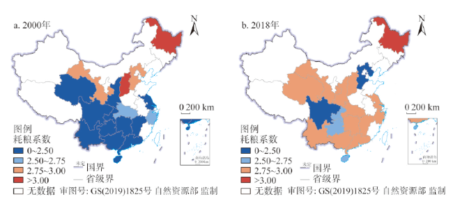 图4 2000年和2018年全规模生猪耗粮系数空间分布注:本图基于自然资源部标准地图服务系统下载的标准地图制作,底图无修改。 Fig. 4 Spatial distributions of the average grain consumption coefficients in 2000 and 2018 |