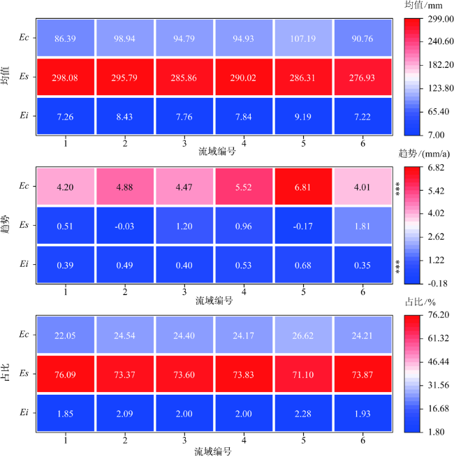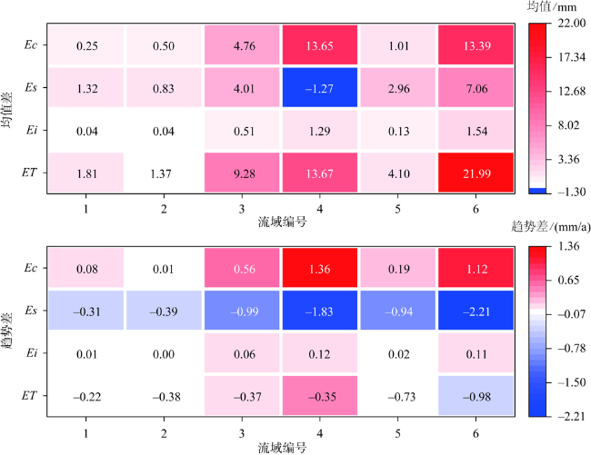 表2 流域中植被恢复区域ET及其组分变化情况Table 2 Regional trend slope and watershed trend slope of vegetation restoration |