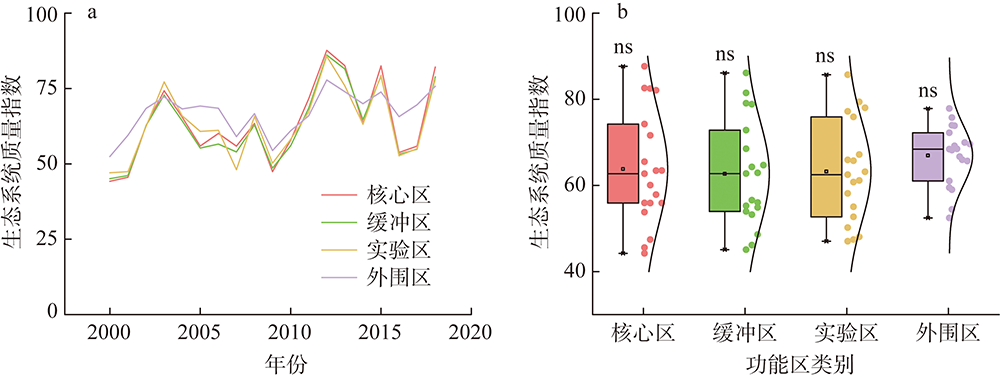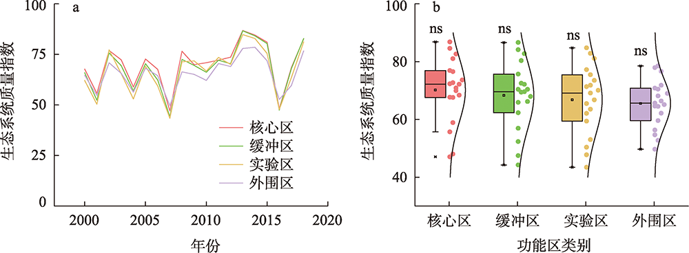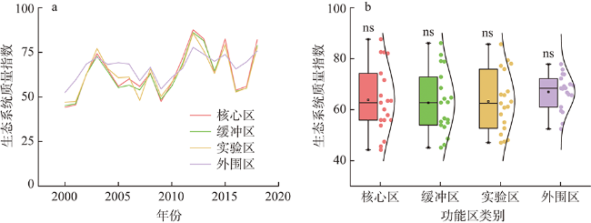 图2 额尔古纳国家级自然保护区各功能区生态系统质量指数变化趋势及单因素方差分析Fig. 2 Changes in ecosystem quality index and ANOVA in each functional area of Erguna National Nature Reserve |