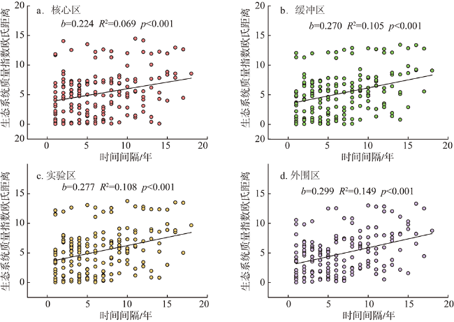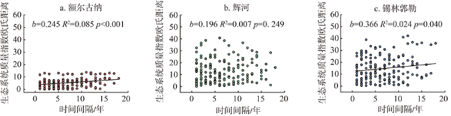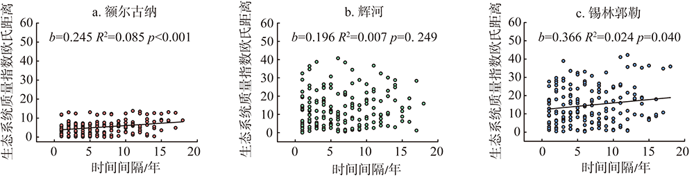 图3 额尔古纳国家级自然保护区各功能区的生态系统质量指数变化的时间间隔回归分析Fig. 3 Time-lag regression analysis of ecosystem quality index changes in each functional area of Erguna National Nature Reserve |