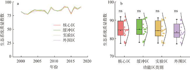 图4 辉河国家级自然保护区各功能区生态系统质量指数变化趋势及单因素方差分析Fig. 4 Changes in ecosystem quality index and ANOVA in each functional area of Huihe River National Nature Reserve |