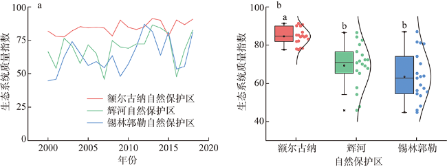 图6 额尔古纳、辉河、锡林郭勒国家级自然保护区生态系统质量指数变化趋势及单因素方差分析Fig. 6 Changes in ecosystem quality index and ANOVA in Erguna National Nature Reserve, Huihe River National Nature Reserve and Xilin Gol National Nature Reserve |