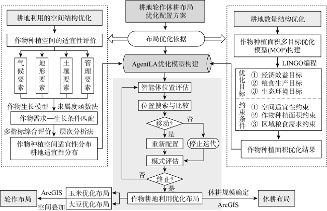 轮作休耕是保障黑土区耕地资源可持续利用的重要手段。科学合理确定粮食作物轮作休耕的耕地利用规模及空间分布,对实现黑土区耕地修养生息、提升地力和平衡粮食供求结构具有重要意义。以东北典型黑土区——克山县、拜泉县和依安县为研究区,运用作物种植空间适宜性评价模型、多目标优化(MOP)模型和智能体土地布局优化配置(AgentLA)模型,基于地块尺度构建耕地轮作和休耕布局,适度调整轮作休耕规模及分布。结果发现:(1)研究区主要作物种植适宜性高值和低值区存在明显空间差异。玉米和大豆种植适宜性高值区交汇于依安县北部和克山县西部,是玉米—大豆轮作优势区域。主要作物种植适宜性低值区交汇于依安县南部和拜泉县西南部,是休耕的重点区域。(2)基于种植结构优化的轮作规模实现了大豆种植比例增加和玉米种植比例减少,缓解了目前玉米阶段性供大于求、大豆供给不足的现实矛盾。通过设定多种粮食供求情景确定休耕规模有利于灵活应对粮食市场变动。(3)兼顾耕地空间适宜性和集聚性的轮作休耕布局有利于充分利用耕地资源禀赋比较优势、发展规模化经营,对提高耕地利用效率具有重要作用。研究通过科学重构黑土区耕地轮作和休耕空间布局,实现了耕地空间适宜性、空间集聚性、种植结构合理性和粮食供求稳定性的同步提升,为实现黑土区耕地资源合理可持续利用和粮食安全提供政策参考。