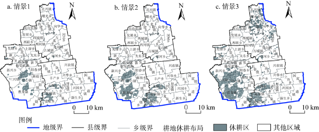 表5 不同情景下研究区耕地休耕布局面积统计Table 5 Statistics on the area of cultivated land fallow layout in different scenarios in the study area |