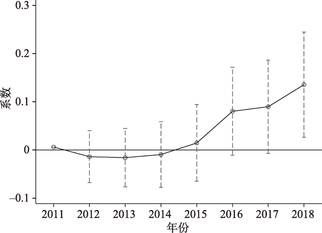 变量 | 2012—2018年 (11) | 被解释变量取对数 (12) | 提前1年 (13) | 提前2年 (14) | PSM-DID (15) |