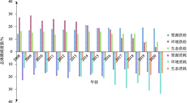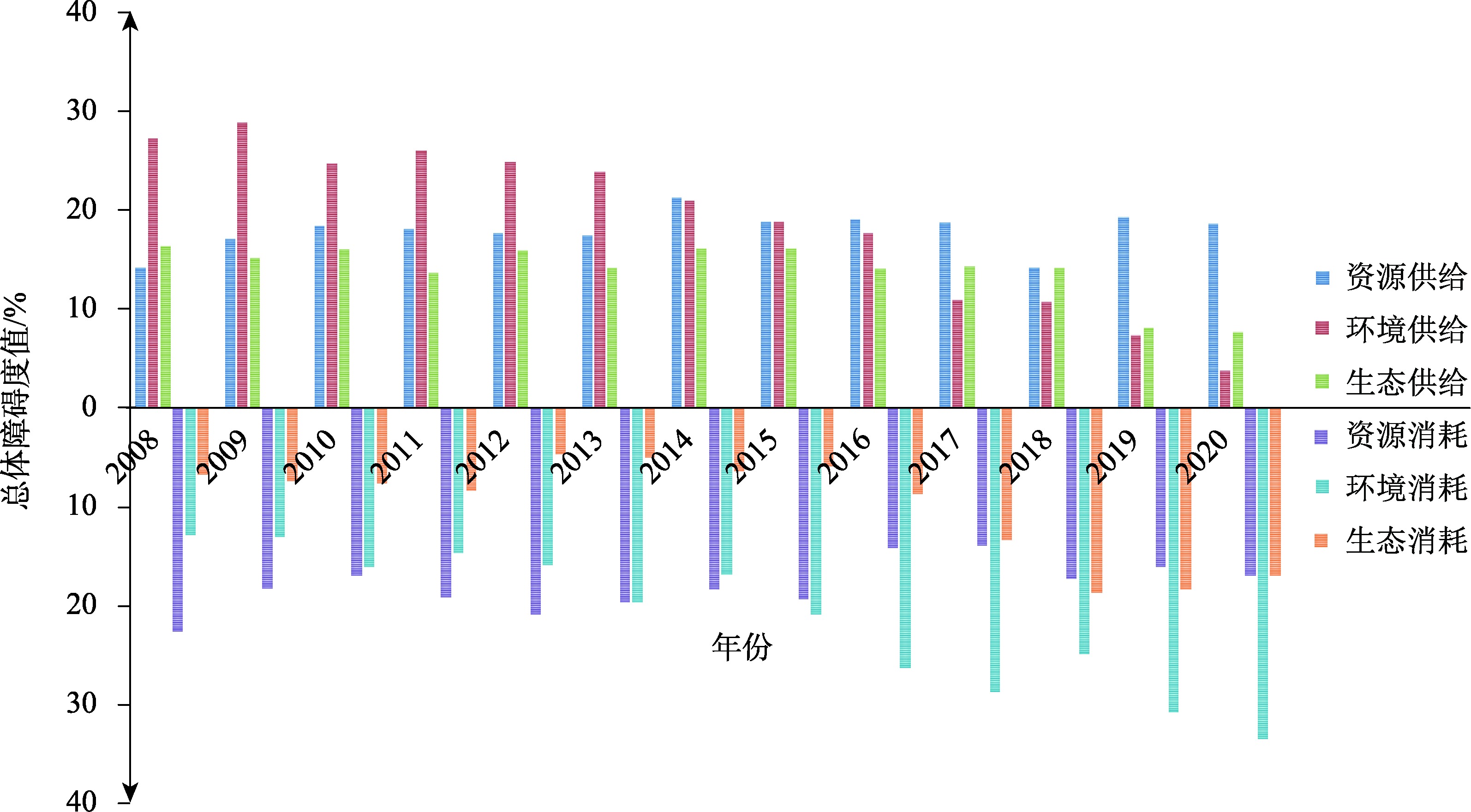 图7 2008—2020年北京市要素系统各维度障碍度对比Fig. 7 Comparison of obstacle degrees in factor systems in Beijing from 2008 to 2020 |