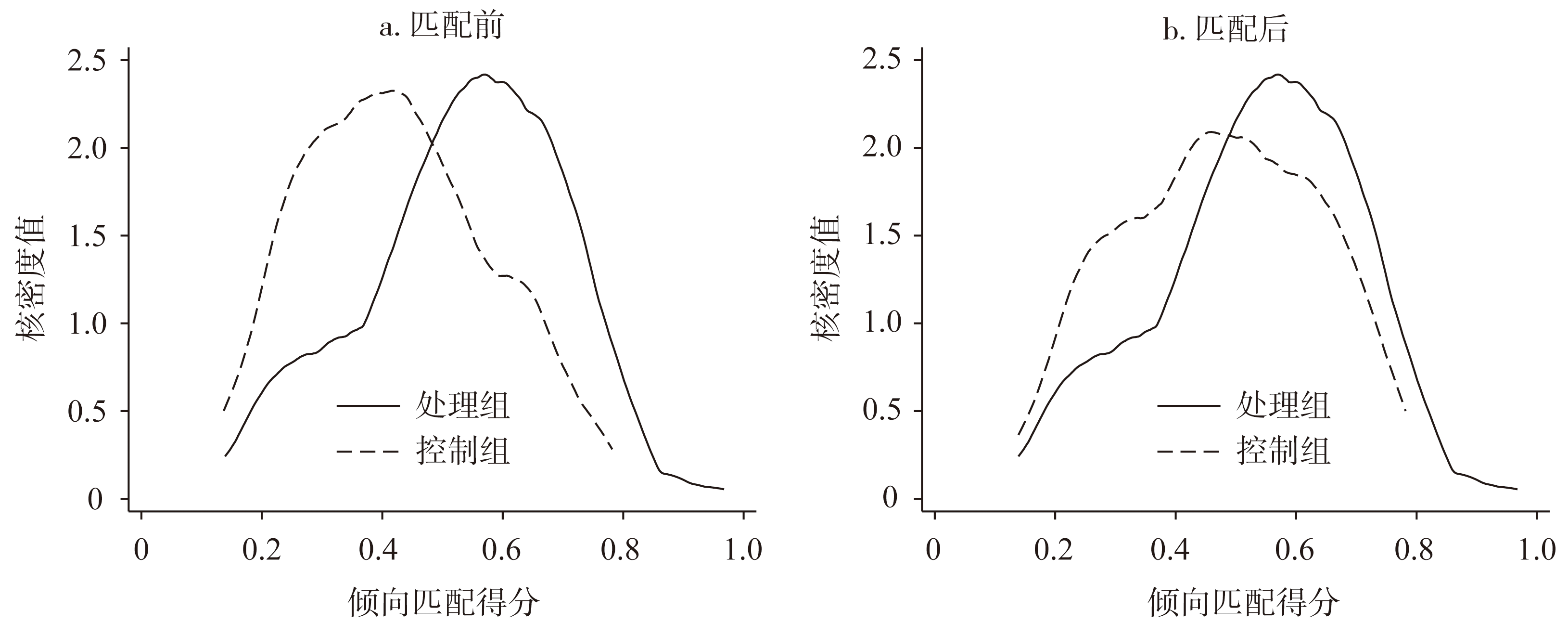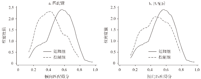 图4 匹配前后的倾向得分核密度Fig. 4 Kernel density function before and after propensity score matching |