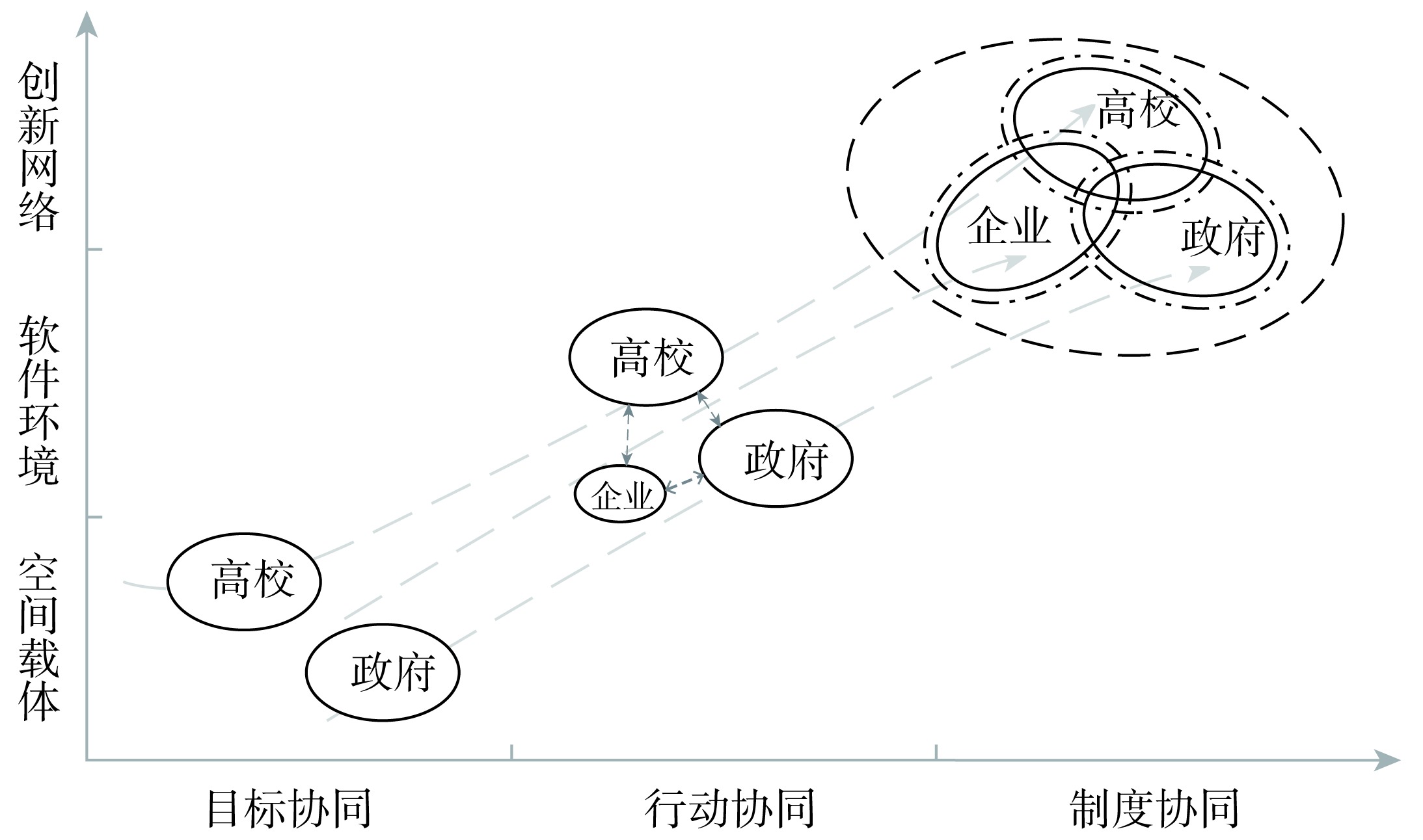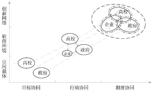 空间 | 有分工协同目标 | 校地互有需求、高度协同目标 | 各自边界内行动,边界外有协同 | 合作与相互介入式行动 | 定期和不定期沟通关系 | 正式的共治框架与股份合作机制 | ||