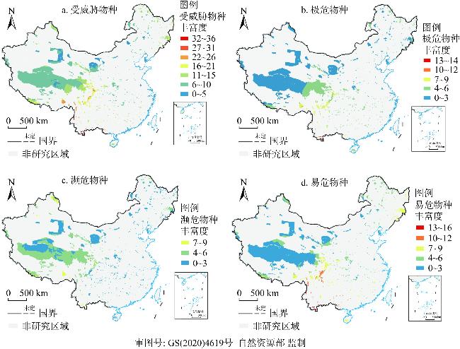 图2 受威胁哺乳动物物种丰富度分布Fig. 2 Distribution of the species richness of threatened mammals in nature reserves of China |