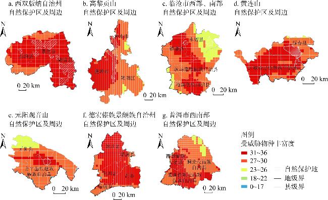 受威胁哺乳动物物种丰富度 | 0~5 | 6~10 | 11~15 | 16~21 | 22~26 | 27~31 | 32~36 |
