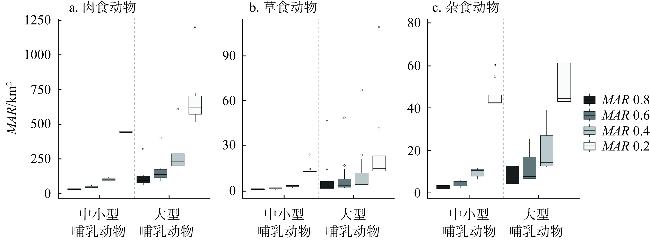 注:表中加粗的部分表示该物种的中位数受保护斑块面积小于该条件下的MAR值。 |