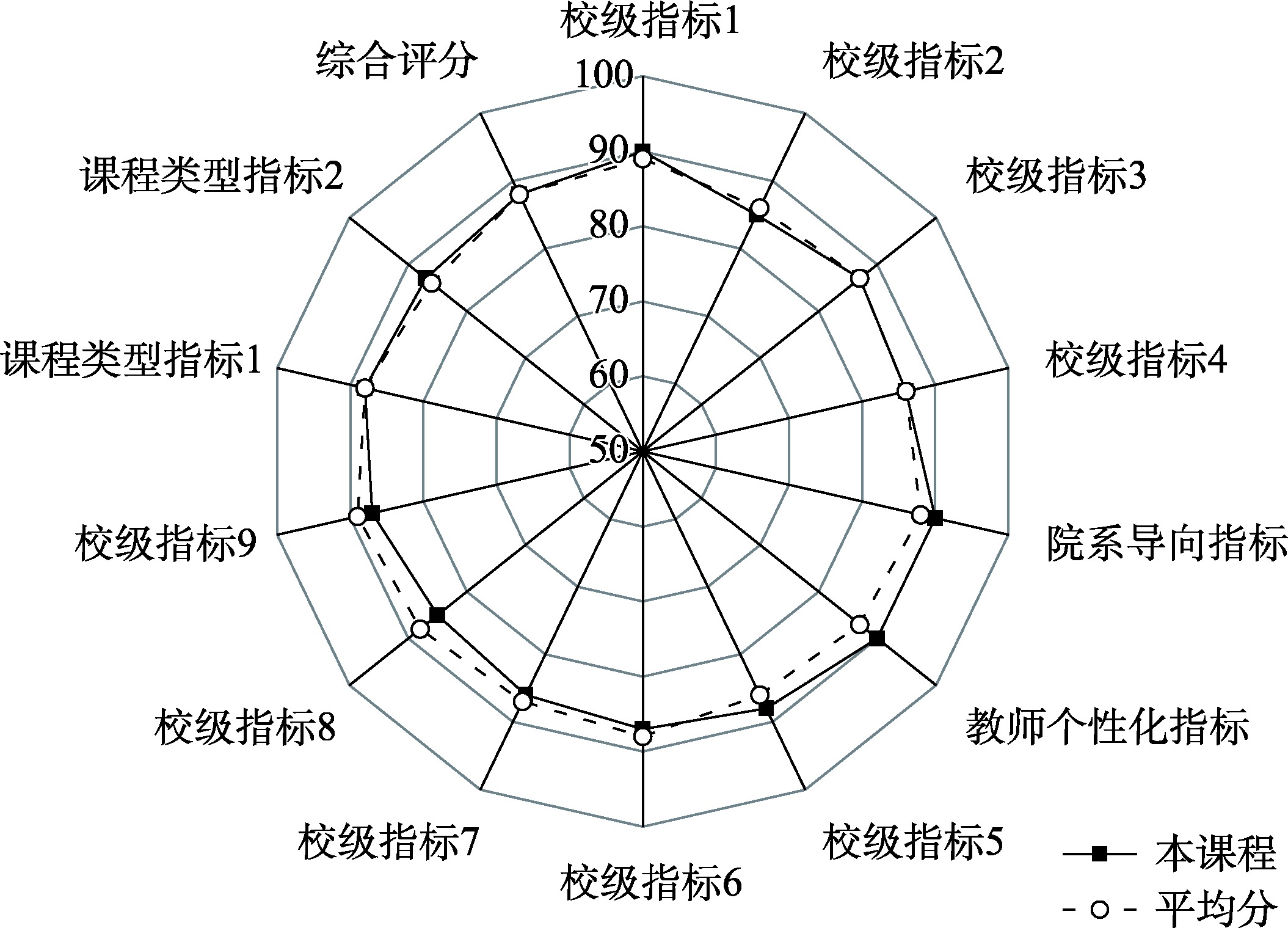 图4 课程各指标的教学成效评价注:校级指标1—老师教学态度认真负责;校级指标2—老师关注我们和我们的学习状态,能够给予反馈;校级指标3—老师对学生严格要求;校级指标4—老师教学注重师生互动;院系导向指标—老师备课认真,对课程的讲解内容和方法做了精心的准备;教师个性化指标—老师讲解显著拓宽我的视野,系统性观念增强;校级指标5—老师教学能让我体会学科特点和思维方式;校级指标6—我了解这门课程的目标和要求;校级指标7—针对这门课的挑战度,老师给予足够的支持;校级指标8—老师的教学激发我课后主动学习;校级指标9—对未来要上这门课程的同学,我会推荐这位老师;课程类型指标1—老师讲解清楚,深入浅出;课程类型指标2—我学习这门课程有收获。数据来源于清华大学教学质量评估中心。 Fig. 4 Assessment of teaching performance indicators for the course |