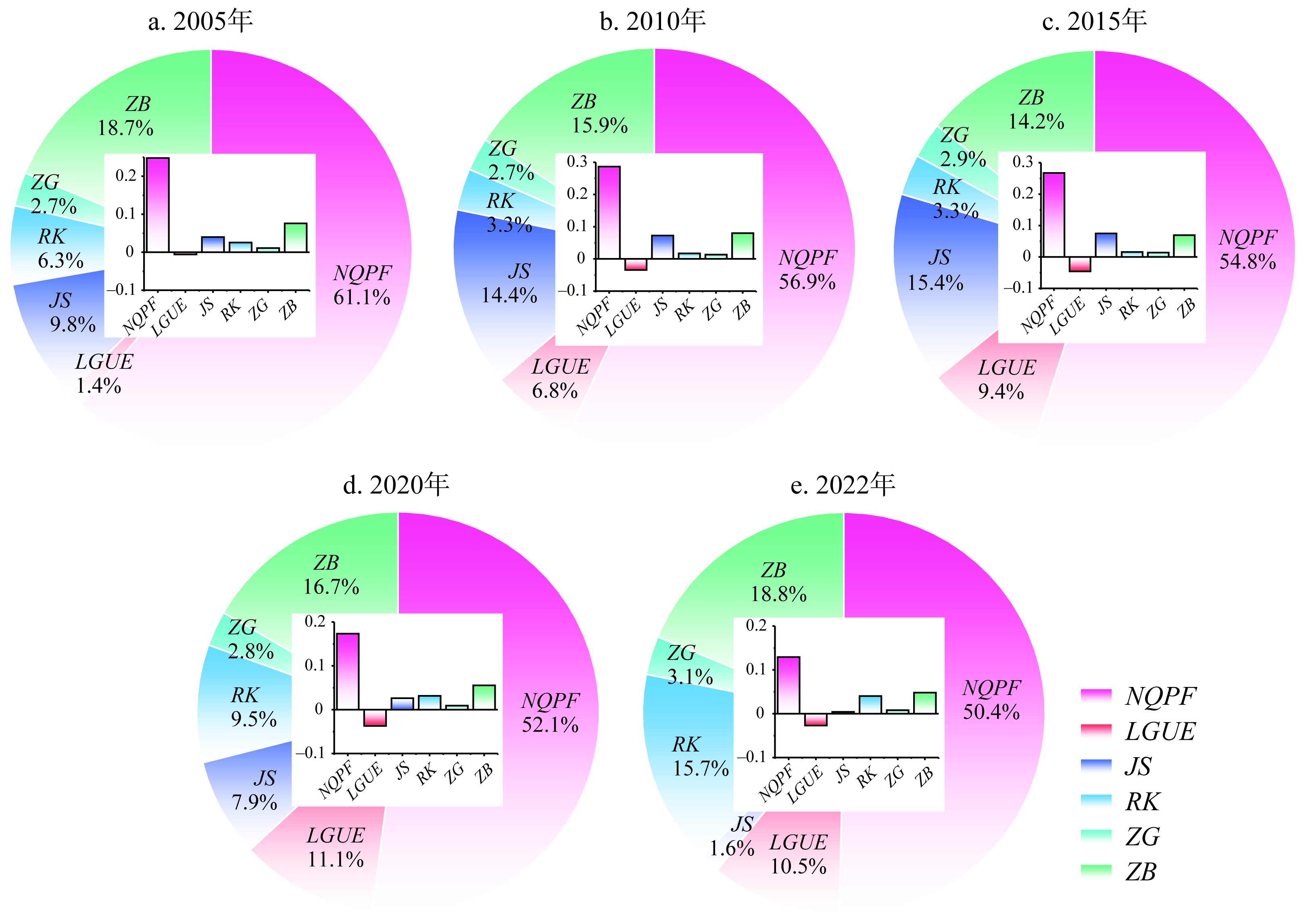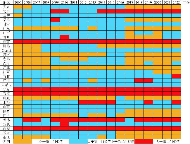 图5 2005—2022年新质生产力与国土空间生态修复规模的重心转移路径Fig. 5 Transformation path of new quality productive forces and territorial space ecological restoration scale from 2005 to 2022 |