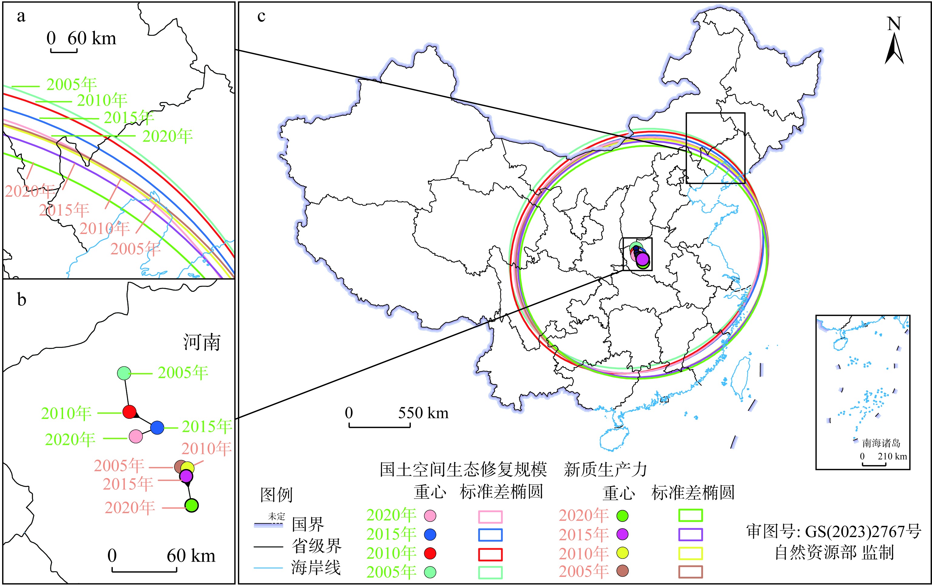 标准差椭圆 | 年份 | 中心坐标 | 短半轴/km | 长半轴/km | 方位角/(°) | 扁率 | 重心坐标 |