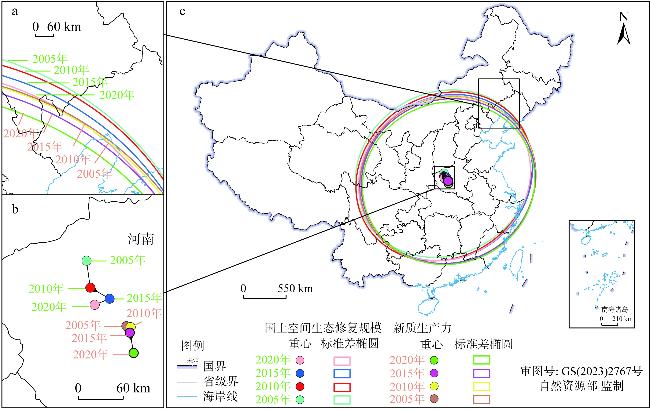 表2 新质生产力与国土空间生态修复规模标准差椭圆与重心变化明细Table 2 Detailed changes in the standard deviation ellipse and center of gravity for the new quality productive forces and territorial space ecological restoration scale |