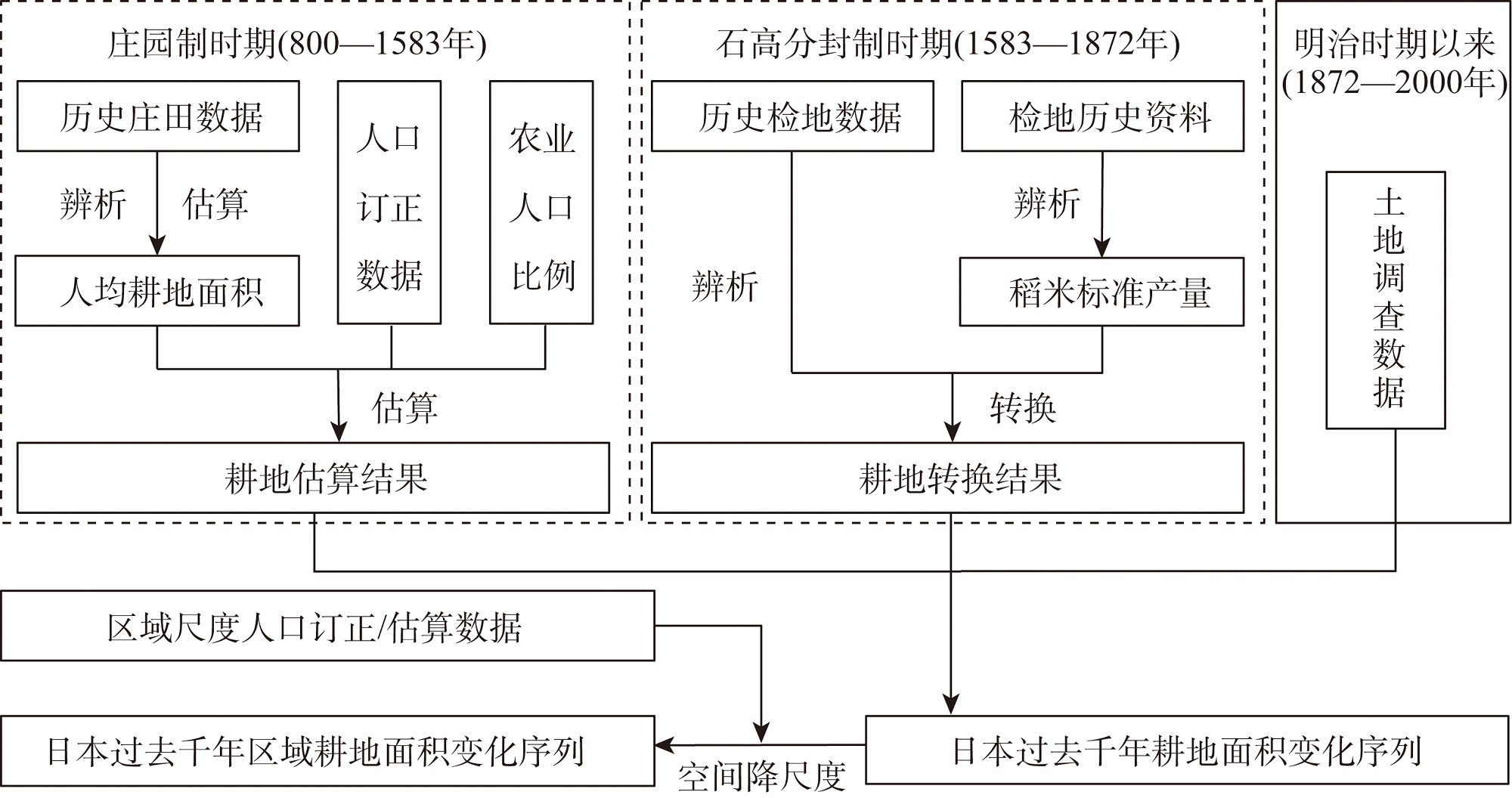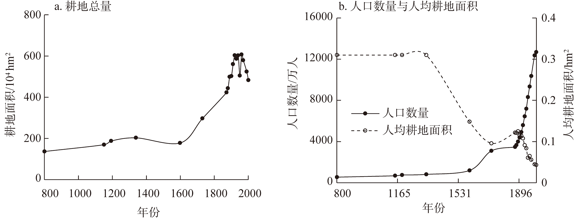 日本过去千年耕地面积、人口数量和人均耕地面积变化趋势