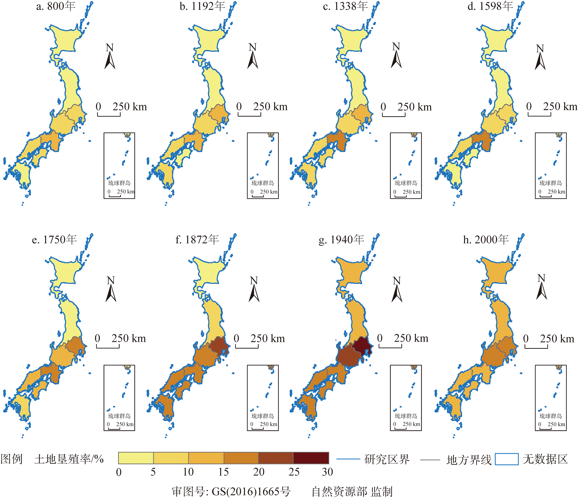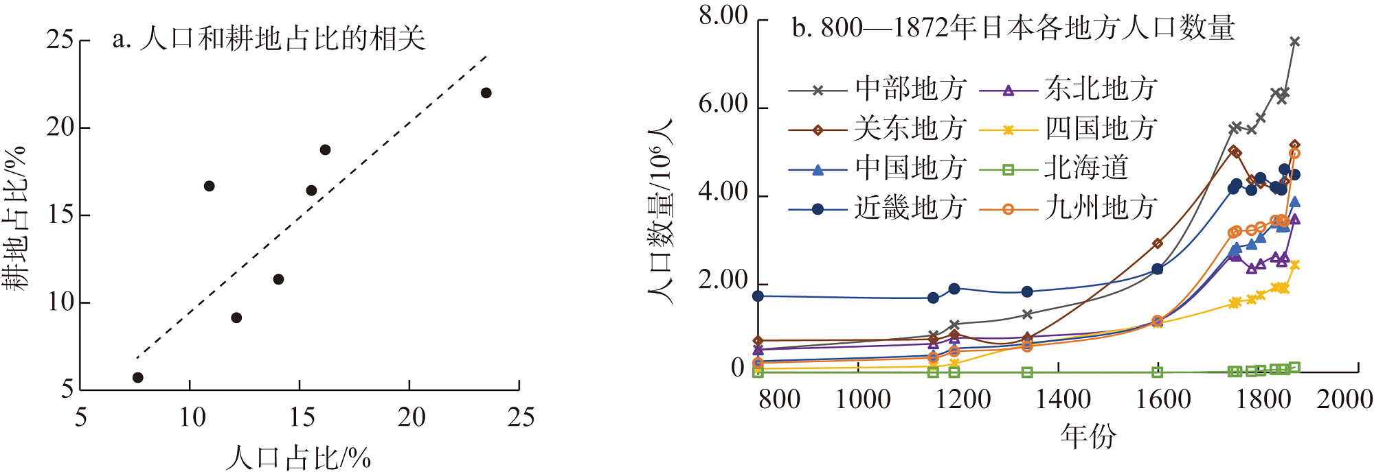 明治初期各地方人口比例和耕地比例的相关关系及800—1872年日本各地方人口数量