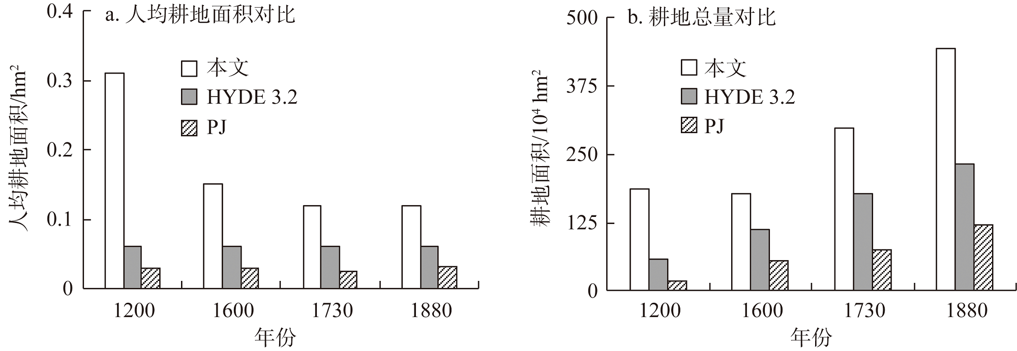 全球数据集中日本1200年、1600年、1730年和1880年人均耕地面积和耕地面积与本文结果对比