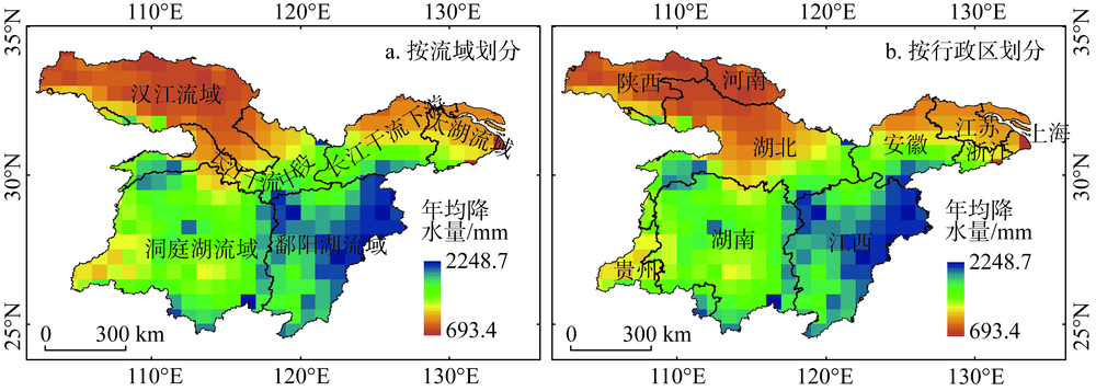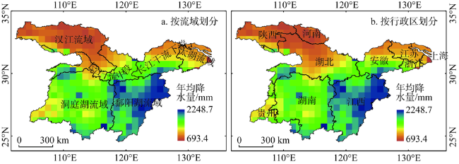 Fig. 1 Spatial distribution of annual precipitation in the middle and lower reaches of the Yangtze River from 1961 to 2015图1 1961-2015年长江中下游地区年均降水量空间分布 |