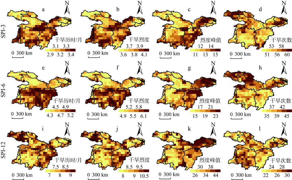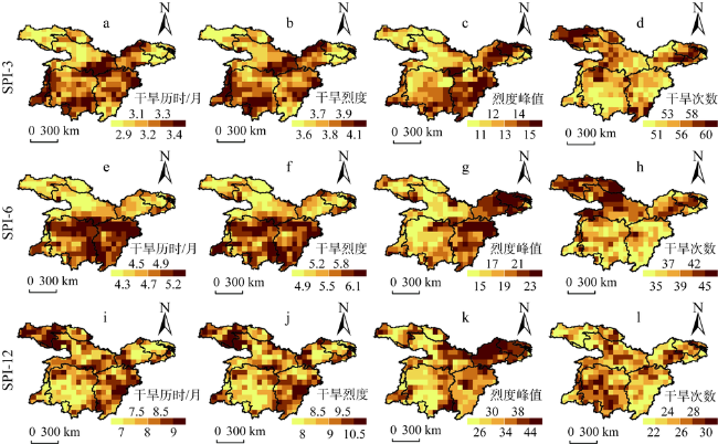 Fig. 3 Spatial pattern of average duration, average severity, maximum severity and number of drought events obtained on the basis of SPI-3, SPI-6 and SPI-12 values, respectively图3 平均干旱历时、平均干旱烈度、烈度峰值、干旱频次的空间格局 |