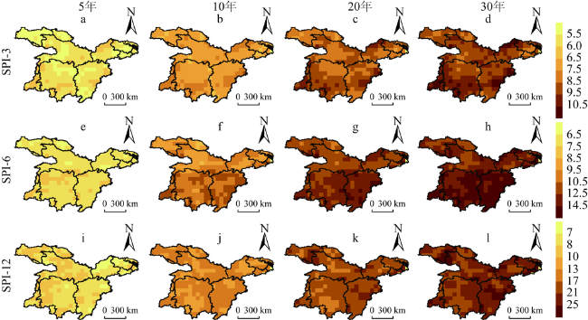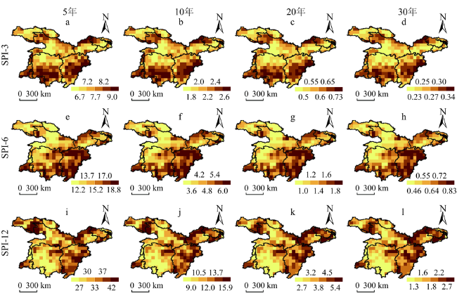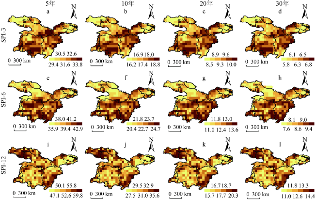 Fig. 4 Spatial patterns of 5 a, 10 a, 20 a, and 30 a return periods of drought severity derived on the basis of SPI-3, SPI-6 and SPI-12 values图4 基于SPI-3、SPI-6和SPI-12值获取的5年、10年、20年和30年重现期的干旱烈度空间格局 |