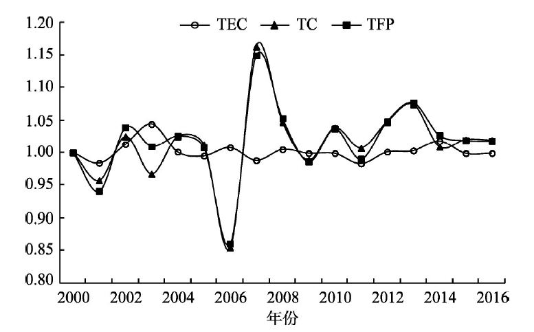Fig. 1 Malmquist efficiency index and its decomposition of agriculture in Chongqing during 2000-2016图1 2001-2016年重庆市农业Malmquist生产率指数及其分解 |