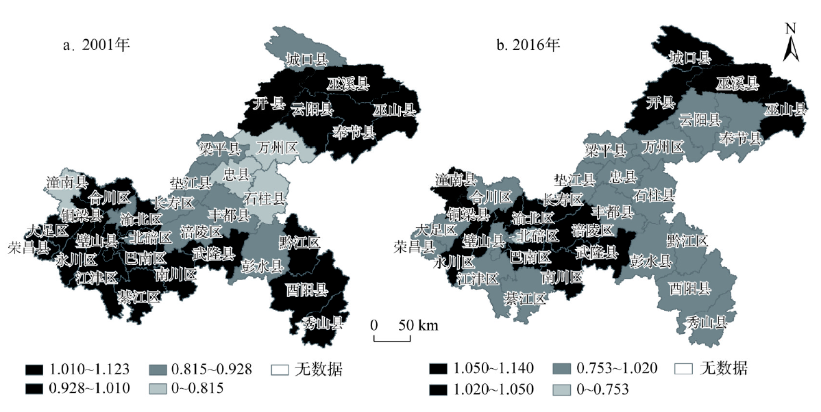 Fig. 2 The spatial distribution of agricultural total factor productivity index of Chongqing in 2001 and 2016图2 2001年和2016年重庆市农业全要素生产率指数空间格局变化 |