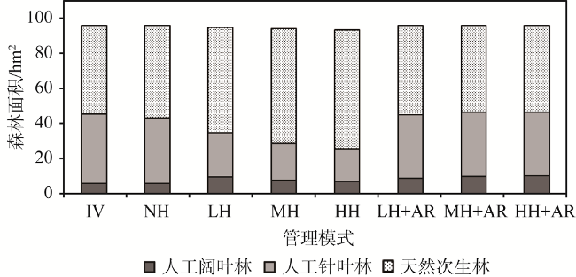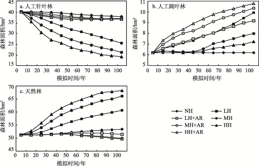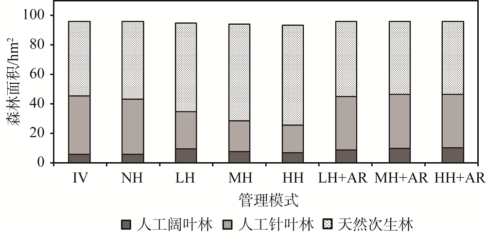 图2 不同森林管理模式下三种类型森林面积变化情况Fig. 2 Dynamic changes of areas of three forest types under forest management scenarios |