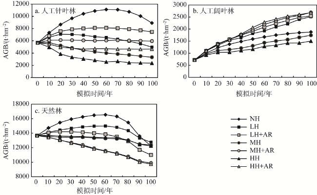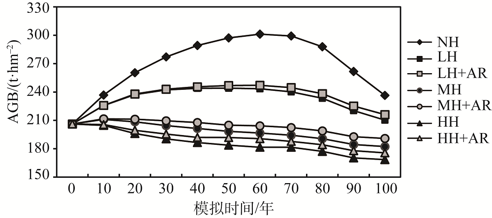 注:NH为无采伐模式;LH为低强度采伐;MH为中强度采伐;HH为高强度采伐;LH+AR为低强度采伐+人工更新;MH+AR为中强度采伐+人工更新;HH+AR为高强度采伐+人工更新;采伐年龄来源《湖南省林木采伐伐区调查设计技术规定》;人工更新Y代表实施,N代表不实施。 |